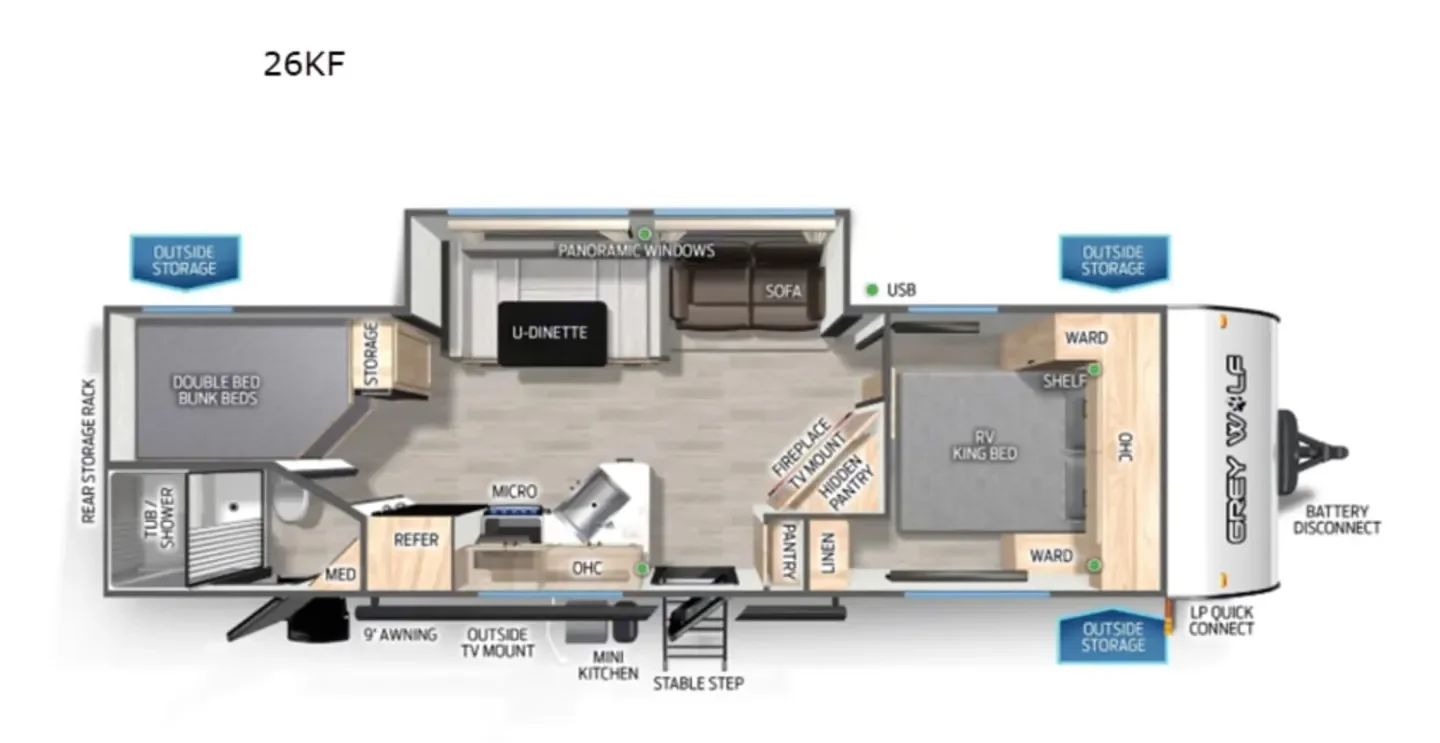 Proudly offered by Central Coast Camper, this brand-new 2026 Cherokee Gray Wolf 26KF bunkhouse travel trailer is the perfect home base for your next getaway. Designed with families and groups in mind, it comfortably sleeps up to 9 guests while offering all the modern amenities you’d expect in a new RV.Inside, you’ll find a fully stocked kitchen, cozy dinette, private master bedroom, and a dedicated bunkhouse that kids (or extra guests) will love. The spacious living area makes it easy to relax after a day of exploring, while the full bathroom, air conditioning, and entertainment system keep everyone comfortable.